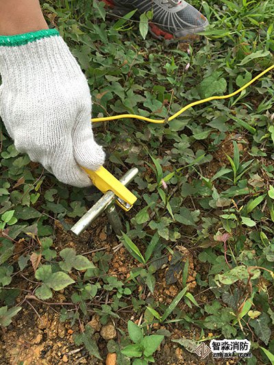 把接地棒打到土壤下,線上有鉗子的一端鉗住接地棒,還要再打三根接地棒。共:紅,黃,綠,黑四根線。接地線的按照H,S,ES,E順序成一直線排列,每個(gè)接地棒之間距離為5米