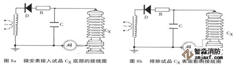 微安表必須有金屬屏蔽,應采用屏蔽線與試品聯接。高壓引線的屏蔽引出應與儀表端的屏蔽緊密聯接。如果試品表面污穢要排除試品表面泄漏電流的影響可在試品高電位端用裸金屬軟線緊密繞幾圈后與高壓引線的屏蔽相聯接(見下圖)。