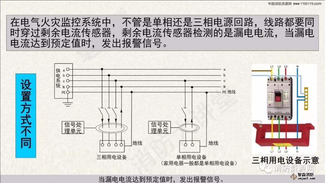 在電氣火災監控系統中,不管是單相還是三相電源回路,線路都要同時穿過剩余電流傳感器。剩余電流傳感器檢測的是漏電電流,當漏電電流達到預定值時,發出報警信號。