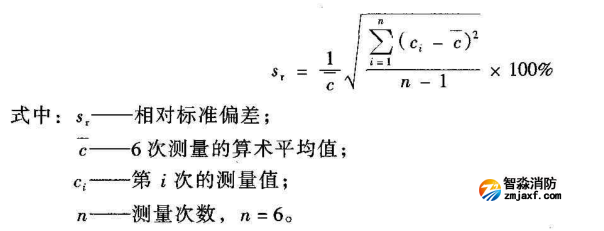 分析儀校準零點后,分別通人約為滿量程80%的標準氣體,待示值穩定后,得到測量值ci。然后回零,上述步驟重復6次,重復性以相對標準偏差、r表示,各參數的sr均可按公式(2)分別計算。