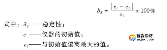 分析儀校準零點后,通入約為量程80%的標準氣體,分別讀取穩定示值c1,作為儀器的初始值。讓儀器連續運行1h,每間隔15min通人一次標準氣體,同時讀取穩定示值ci。每種標準氣體讀取穩定示值4次,取與初始值偏離最大的值ci。按公式(3)計算穩定性δs.